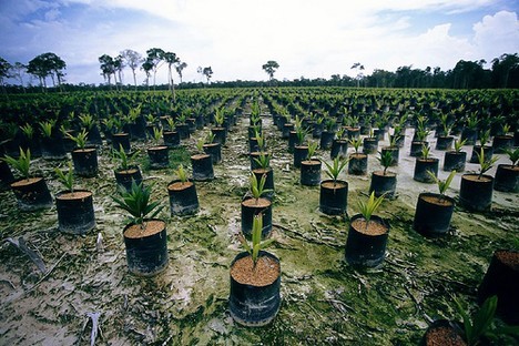 Una piantagione di olio di palma in Indonesia. Dei vasi di coltura della pianta della palma occupano lo spazio un tempo da una fitta foresta pluviale