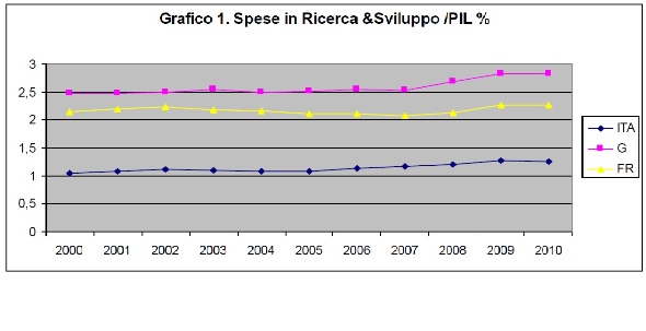 Gli indicatori di base parlano chiaro. Il rapporto tra ricerca scientifica e PIL, due volte superiore a quello del’Italia, è nettamente inferiore a quello della Germania (vedi Grafico 1)
