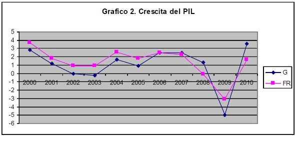 Si eliminano in questo modo posti di lavoro di livello inferiore , mentre si salvaguardano quelli con più elevato livello di specializzazione. Riassuntivi i dati relativi al PIL: a partire dal 2006 il tasso di crescita della Germania diventa sistematicamente superiore a quello della Francia (vedi Grafico 2).