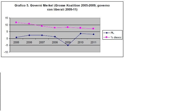 Ciononostante gli effetti di quelle misure sono positive per l’economia tedesca che proprio in coincidenza con la fine del mandato di Schroeder e l’inizio dell’era Merkel si stabilizza su valori positivi (vedi grafici 4 e 5).