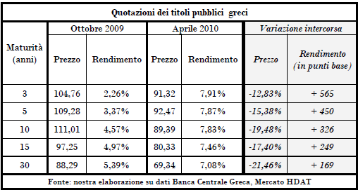 La Banca Centrale Greca ha ampliato, a partire dal novembre 2009, quell’intervallo di tempo da tre a dieci giorni: se prima gli speculatori potevano spingere al ribasso i prezzi per soli tre giorni, e poi erano costretti a ‘coprire’ la propria posizione, riacquistando i titoli venduti, le nuove regole consentivano di mantenere la posizione ‘scoperta’ per dieci giorni consecutivi, e dunque di produrre una spinta al ribasso prima impensabile. Quella spinta, di natura speculativa, ma resa possibile dalla misura introdotta dall’autorità monetaria, può essere collocata all’origine della dinamica degli spread.