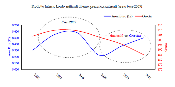 In effetti il percorso di crescita della Grecia, che aveva seguito quello dei paesi vicini fino al 2008, prosegue in caduta libera proprio in concomitanza con la stagione delle misure di austerità, mentre gli altri paesi dell’eurozona accennavano una lenta ripresa dalla crisi del 2007: