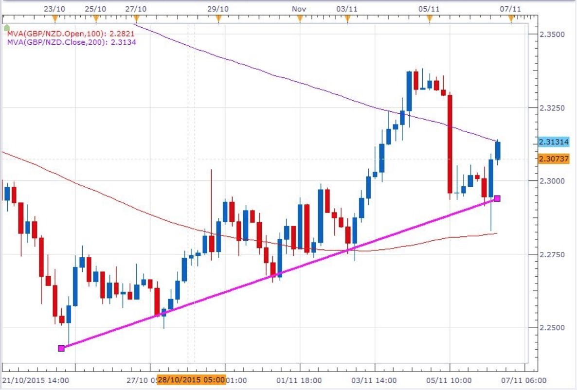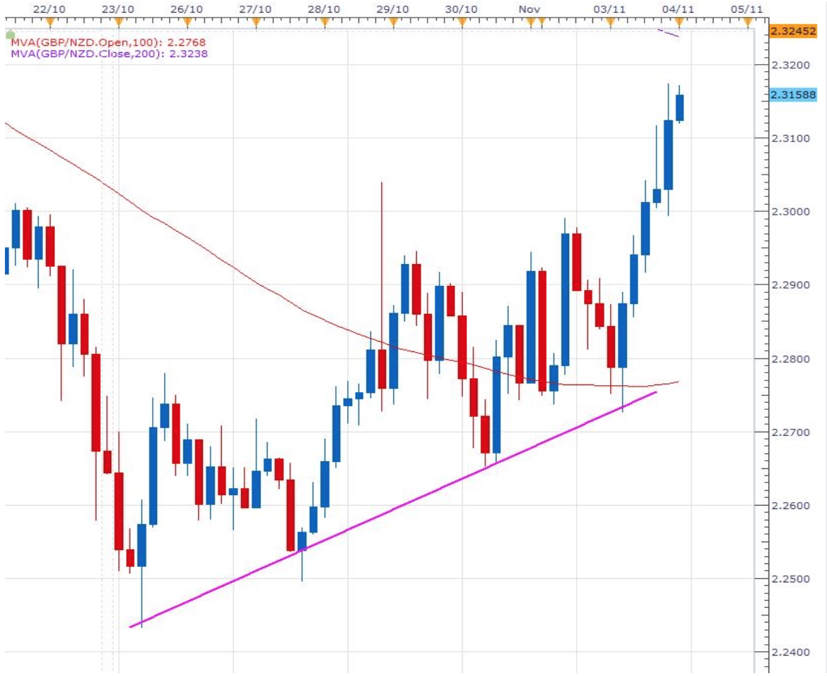 La rottura del livello 2,30, sotto il quale la coppia era rimasta dal 9 ottobre (quindi da diciassette giorni di trading), portava a farci credere ad una ricettività della coppia a notizie e dati positivi per la Sterlina e negativi per il Kiwi, ad esempio: lunedì 2 novembre, la GBP/NZD saliva di circa 140 punti in risposta ai dati positivi dell’Indice dei Direttori agli Acquisti britannico (che risultava essere il 55,5 rispetto al precedente 51,8); aggiungendo una Sterlina rafforzata ed un dollaro neozandese indebolito agli eventi che avrebbero avuto luogo il giovedì 5 e il venerdì 6, rispettivamente la decisione sui tassi d’interesse della Banca d’Inghilterra ed i ’Non-Farm Payrolls’ (NFP) statunitensi, si sarebbe potuta verificare una rottura del 2,30 ed una continuazione a oltranza.