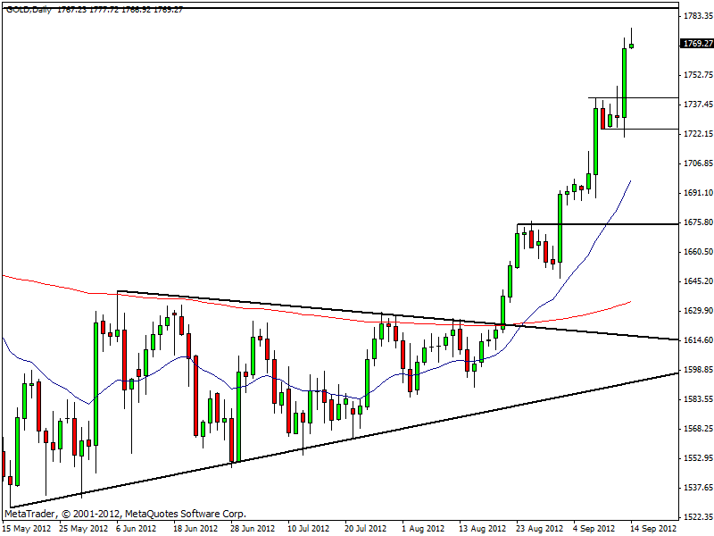 Con il lancio del QE3 ora le quotazioni dell’oro potrebbe salire fino a toccare i precedenti massimi storici di area 1.920$ entro fine anno. Oggi l’oro ha toccato il massimo più alto degli ultimi 6 mesi a 1.777,8 dollari l’oncia, ma entro fine seduta potrebbe avvenire un nuovo strappo verso quota 1.800 dollari.