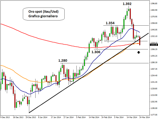 Prosegue la fase negativa per l’oro, che sui mercati internazionali continua a essere bersagliato dalle vendite dopo aver toccato il massimo più alto degli ultimi 6 mesi a 1.392$ l’oncia lo scorso 16 marzo. Da questo picco è partita una violenta correzione dei prezzi, complice la diminuzione delle tensioni geopolitiche in Ucraina, dopo l’annessione della Crimea da parte della Russia, e la ripresa del dollaro americano, a seguito della bias restrittiva emersa nell’ultima riunione della FED che ha confermato il tapering a 10 miliardi di dollari al mese e previsto il primo ritocco dei tassi di interesse nella primavera del 2015.