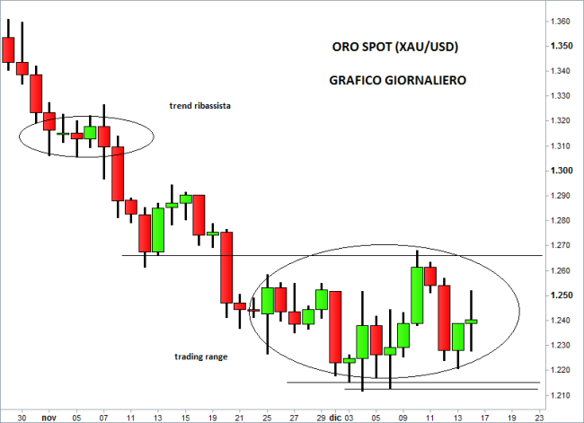 Giornata positiva quella di ieri per l’oro, che è riuscito a rimbalzare con decisione dai supporti di breve termine di area 1.230 dollari spingendosi nuovamente sopra la soglia di 1.250 dollari l’oncia. Il metallo prezioso resta inserito all’interno di un ampio trading range, che ormai dura da diverse settimane. Intanto mentre il metallo giallo si appresta a chiudere il primo anno in rosso (peggiore performance dal 1981), dopo ben 12 anni consecutivi di rialzi, continua il deflusso dagli Etf che investono in oro fisico. Nella settimana chiusa venerdì 13 dicembre, sono arrivati nuovi deflussi per 15,5 tonnellate.