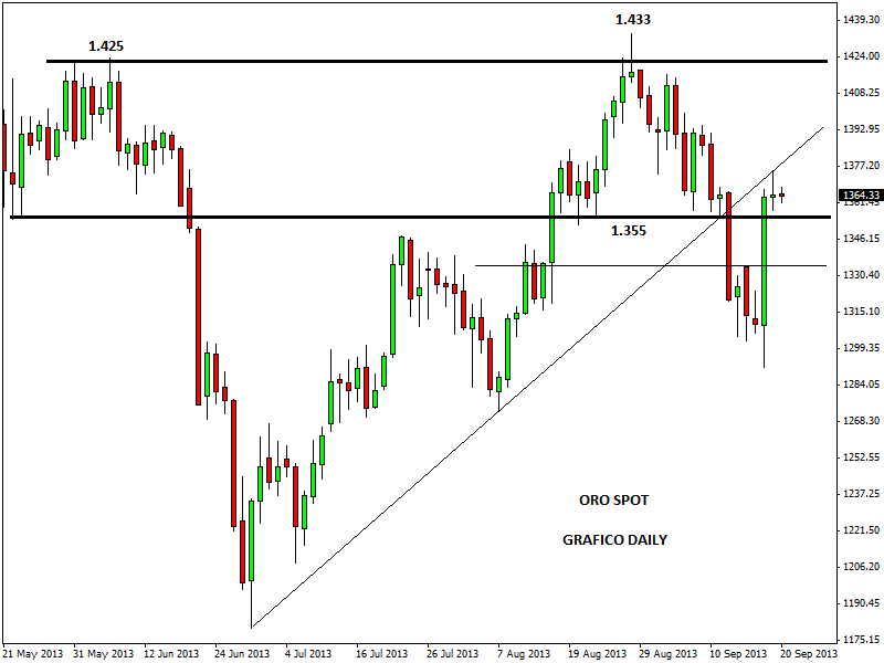 La decisione della FED di rinviare il tapering, ovvero il piano di ridimensionamento degli stimoli monetari, ha creato i presupposti per un nuovo balzo dell’oro, che mercoledì ha registrato la migliore seduta degli ultimi 15 mesi guadagnando quasi il 5%. Ieri i prezzi hanno proseguito al rialzo fino a 1.375 dollari. E pensare che mercoledì, qualche ora prima dell’annuncio della FED, l’oro era sceso fin sotto 1.300 dollari sui minimi da oltre un mese a 1.291 dollari. Poi dalle ore 20 in poi della giornata di mercoledì è iniziato un boom esaltante dei prezzi.