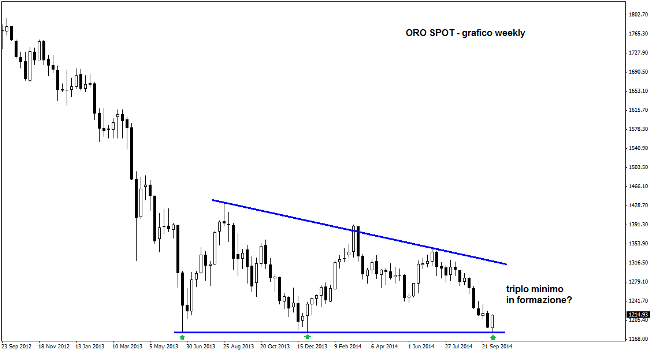 La quiete dopo la tempesta. L’oro torna a respirare dopo aver attraversato una fase di mercato molto complicata, durante la quale la quotazione è scesa fino all’area di supporto chiave di lungo periodo di 1.180$ l’oncia. Lunedì i prezzi si sono accomodati sul supportone, dove comunque sono riusciti a rimbalzare con decisione a partire da un minimo di 1.183$ l’oncia. Su base weekly inizia a configurarsi un triplo minimo molto interessante (vedi grafico in basso), potenzialmente in grado di far ripartire le quotazioni dopo il crollo avvenuto negli ultimi tre mesi.