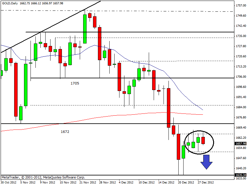 Da quel momento è iniziata una fase di congestione poco sopra i minimi di periodo, tra 1.668$ e 1.652$ circa. Dopo tre sedute positive, ma senza alcun strappo rilevante, l’oro è tornato a scendere quest’oggi e attualmente la quotazione è a 1.658$ l’oncia. In caso di perdita decisa di 1.650$, è molto probabile un sell-off con target a 1.635$ prima e 1.625$ poi.