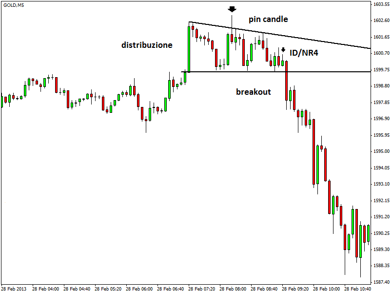 Ad esempio, andiamo ad analizzare il grafico a 5 minuti del GOLD, che sta salendo su base intraday mentre su base giornaliera mostra un forte bearish trend. I prezzi raggiungono l’area di resistenza di 1.600 dollari. Qui iniziano a manifestarsi le prime difficoltà di risalita dei prezzi. Appare una pin candle, poi si forma una fase di congestione con bassa volatilità. La comparsa di un ID/NR4 aumenta le possibilità di un breakout del micro-supporto: la formazione di una long candle ribassista dà il via ad un robusto bearish trend.