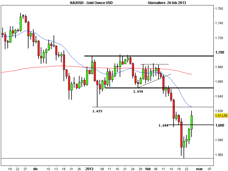 A questo punto ci si chiede se l’exploit dell’oro sia solo un rimbalzo tecnico oppure se è n corso un’inversione del trend. La sensazione è che l’oro possa muoversi tra 1.620 e 1.640 dollari nei prossimi giorni, a patto che i prezzi riescano a mantenere il supporto "psicologico" di 1.600 dollari. Un ritorno deciso sotto 1.600 potrebbe far ritornare le vendite sul metallo giallo, con obiettivo posto a 1.570 dollari prima e 1.530 dollari poi.