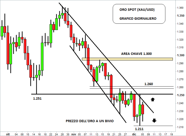 Resta ancora critico il quadro tecnico dell’oro, nonostante il forte rimbalzo di due giorni fa. Ieri la quotazione spot è diminuita quasi dell’1%, ma poteva andare anche peggio se non fossero scattati gli acquisti a seguito della violazione del supporto di 1.220$. Stamattina l’avvio è debole e i prezzi stanno consolidando sotto 1.230$. Gli alti e bassi del metallo giallo degli ultimi giorni riflettono il continuo cambiamento del mood degli investitori che stanno cercando di capire, prima della riunione del 17 e 18 dicembre del FOMC, il probabile orientamento della Federal Reserve sul tapering dopo la pubblicazione degli ultimi dati macroeconomici americani.