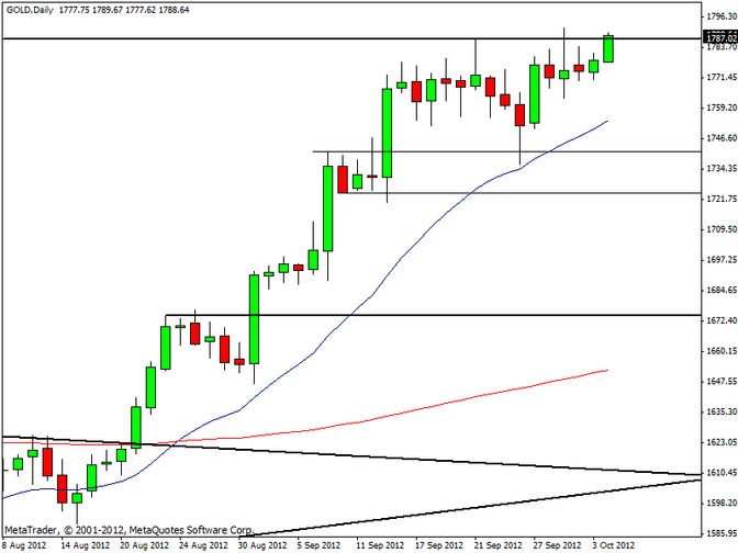 Continua l’ottimo momento per il prezzo dell’oro, che anche oggi è in rialzo sui mercati internazionali. La quotazione del prezioso metallo giallo ha sfiorato quota 1.790$ l’oncia, a un passo dai precedenti top di periodo di 1.791,5$ l’oncia (i più alti da novembre 2011, ndr) toccati il primo ottobre. In caso di breakout rialzista, il prezzo dell’oro dovrebbe dirigersi verso 1.800$ l’oncia.