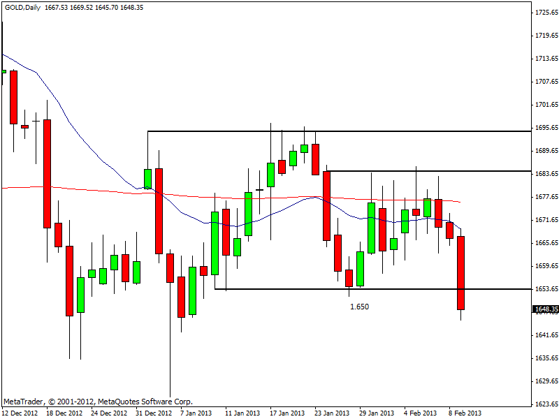 Il quadro tecnico dell’oro è in costante peggioramento. Pochi minuti fa il metallo giallo ha sperimentato una decisa esplosione della volatilità, che ha spinto i prezzi fin sotto l’area-chiave di 1.650$ l’oncia. L’oro è sceso fino a 1.645$ sui minimi a un mese, ma a questo punto potrebbe approfondire ulteriormente al ribasso nei prossim giorni fino in area 1.630$ - 1.625$ l’oncia. Negli ultimi tempi diversi broker hanno tagliato le loro stime sul prezzo medio del metallo giallo per l’anno in corso, dopo che il 2012 si è chiuso con il 12-esimo anno consecutivo di guadagni. Credit Suisse ha di recente affermato che il rally di lungo periodo dell’oro è ormai giunto al capolinea, mentre va in controtendenza Jp Morgan che si aspetta un ritorno in area 1.800$ già entro il primo semestre del 2013.