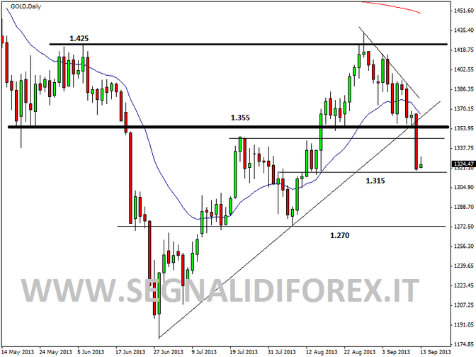 I venditori sono riusciti a perforare questo livello chiave e a provocare un brusco sell-off fin sotto 1.320 dollari. Anche stamattina resta forte la pressione in vendita, per cui il metallo prezioso potrebbe accelerare ancora verso il basso magari spingendosi fino alla soglia psicologica dei 1.300 dollari, che corrisponde al 50% del ritracciamento della gamba rialzista iniziata il 28 giugno a 1.180 dollari e terminata il 28 agosto a 1.433 dollari.