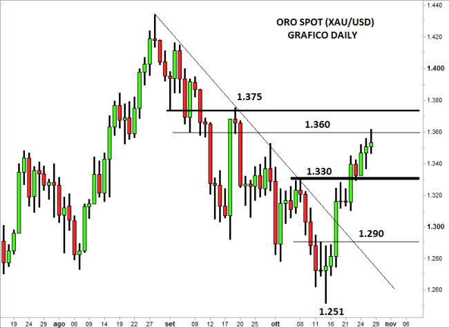 Nelle ultime due settimane l’oro ha sperimentato un rimbalzo tecnico, dopo aver toccato il livello più basso da oltre tre mesi a 1.251 dollari l’oncia lo scorso 15 ottobre. Da allora, però, sono scattati nuovamente gli acquisti, che hanno spinto le quotazioni del metallo prezioso fin sopra 1.360 dollari l’oncia. Ma cos’è che ha ridato slancio al più classico dei beni rifugio? La prima motivazione è riconducibile all’effetto-FED, visto che l’istituto monetario di Washington ha fatto intendere che quasi certamente il tapering non avrà inizio prima del 2014. Così, anche dalla riunione di domani, dovrebbe emergere la volontà di proseguire con l’attuale piano di stimoli monetari da 85 miliardi di dollari al mese almeno fino all’inizio del prossimo anno.