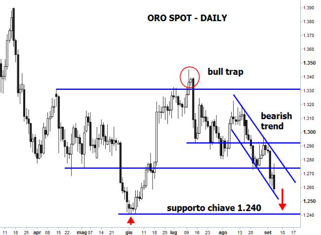 La forza del dollaro e la fine ormai imminente del tapering stanno spingendo al ribasso l’oro, che stamattina è sceso sotto 1.260$ ai minimi da giugno scorso