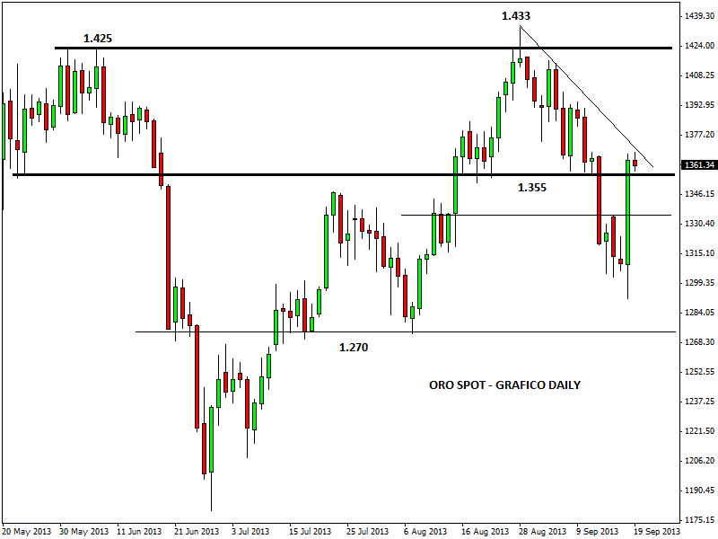 Il rinvio del tapering non poteva che fare bene alle commodity, che negli ultimi tempi avevano perso decisamente terreno anche a causa delle aspettative di avvio del piano di riduzione degli stimoli monetari da parte della FED. Tra le materie prime che hanno beneficiato maggiormente di questa decisione c’è senza dubbio l’oro, legato a stretto filo con il dollaro americano. Il clamoroso sell-off del biglietto verde ha chiaramente sostenuto le quotazioni del metallo prezioso, che negli ultimi anni aveva costruito le proprie fortune grazie al lancio dei tre round di quantitative easing della FED.