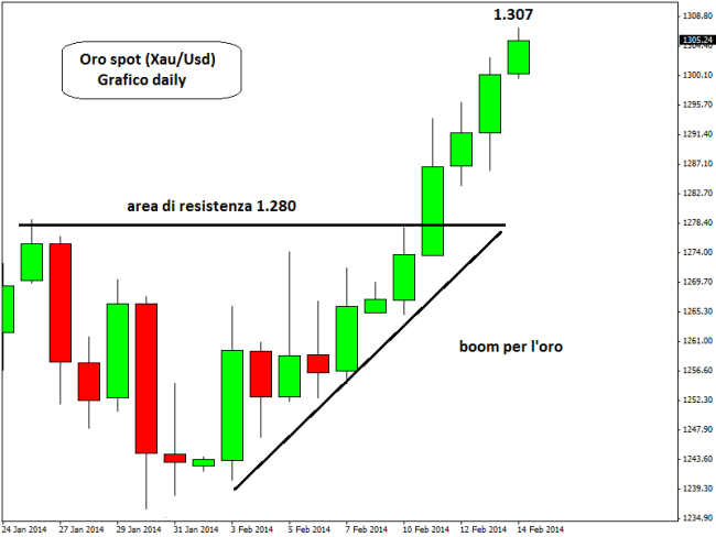 Da un punto di vista tecnico bisogna ricordare che l’oro ha formato un pattern di inversione di medio periodo noto come “doppio minimo”, ben visibile se si osserva il grafico su base weekly. Dopo aver superato una congestione compresa tra 1.280$ e 1.240$, i prezzi si stanno dirigendo verso i target “naturali” dell’attuale movimento rialzista che si trovano tra 1.310$ e 1.325$ l’oncia. Secondo alcuni analisti finanziari, l’oro potrebbe salire anche molto di più grazie al fenomeno dello short squeeze, ovvero la ricopertura frettolosa di posizioni short ancora aperte dallo scorso anno. In questo caso si può ipotizzare addirittura un ritorno sulla resistenza di 1.360$ prima e di 1.400$ poi.