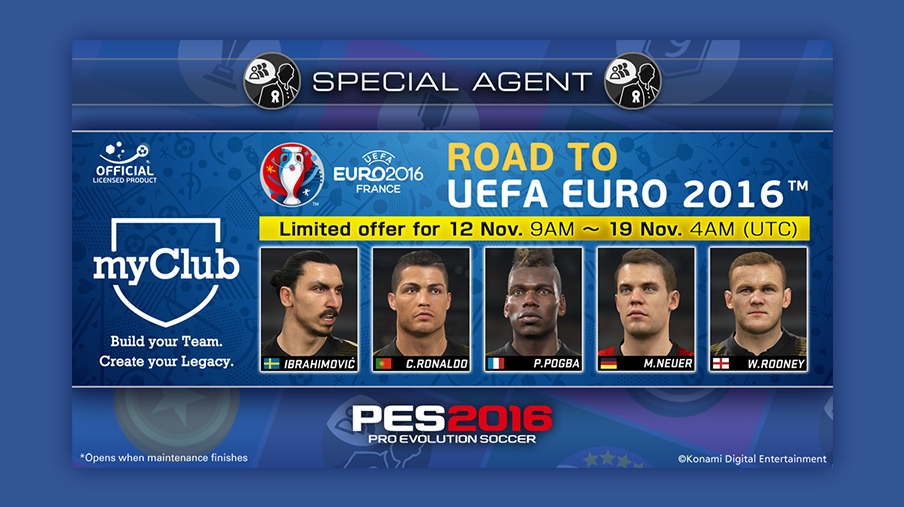 Inoltre, ci sono delle novità per la modalità myclub: nel dettaglio, in occasione del campionato Europeo verranno rilasciati degli incentivi per il myclub, chiamati “agenti speciali Euro” che permetteranno l’ingaggio dei migliori giocatori della competizione nella propria squadra. Chi invece acquisterà la versione fisica di PES UEFA Euro 2016, riceverà un incentivo speciale che permetterà l’ingaggio di sette giocatori simbolo delle varie nazionali.