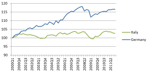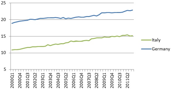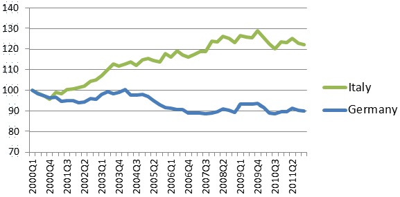 Gli indici dei costi unitari del lavoro per l’Italia (linea verde) e la Germania (linea blu) sono mostrati in figura 1. Tra il primo trimestre del 2001 e l’ultimo del 2011, il costo unitario del lavoro in Italia è aumentato di 23 punti percentuali in più rispetto ai suoi partner commerciali (un apprezzamento reale), mentre i costi unitari del lavoro in Germania sono diminuiti di 9,7 punti percentuali (un deprezzamento reale) . Che cosa spiega l’enorme aumento dei costi unitari del lavoro in Italia?
