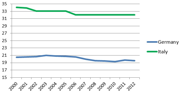 La Figura 4 mostra l’aliquota fiscale media sui contributi previdenziali versata dai datori di lavoro. La differenza tra i livelli della Germania e dell’Italia è sorprendente, anche se abbastanza stabile (il tasso italiano è sceso di due punti e il tedesco di un punto tra il 2000 e il 2012).