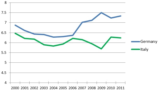 La Figura 2 mostra l’evoluzione del costo medio di un’ora di lavoro in Italia e in Germania nell’ultimo decennio. Nel 2000, il prezzo di un’ora di lavoro in Germania è stato quasi il doppio che in Italia (circa 19 euro rispetto a 10,9). Nel decennio successivo i salari nominali per ora sono stati convergenti, anche se non completamente: essi sono aumentati del 39,5% in Italia contro il 21,1% della Germania.
