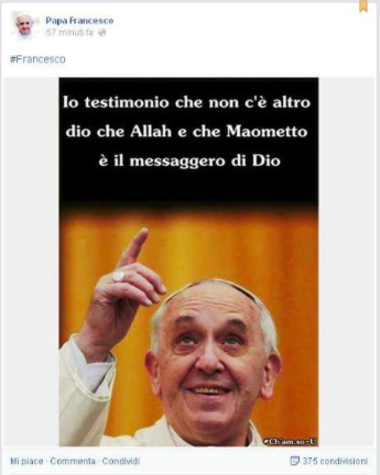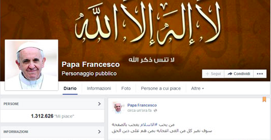 Domenica scorsa verso le 15 sono apparse sulla pagina Facebook non ufficiale di Papa Francesco scritte in islamico corredate da immagini pro Islam, contro il Papa, Barack Obama ed in generale messaggi di fede islamica.