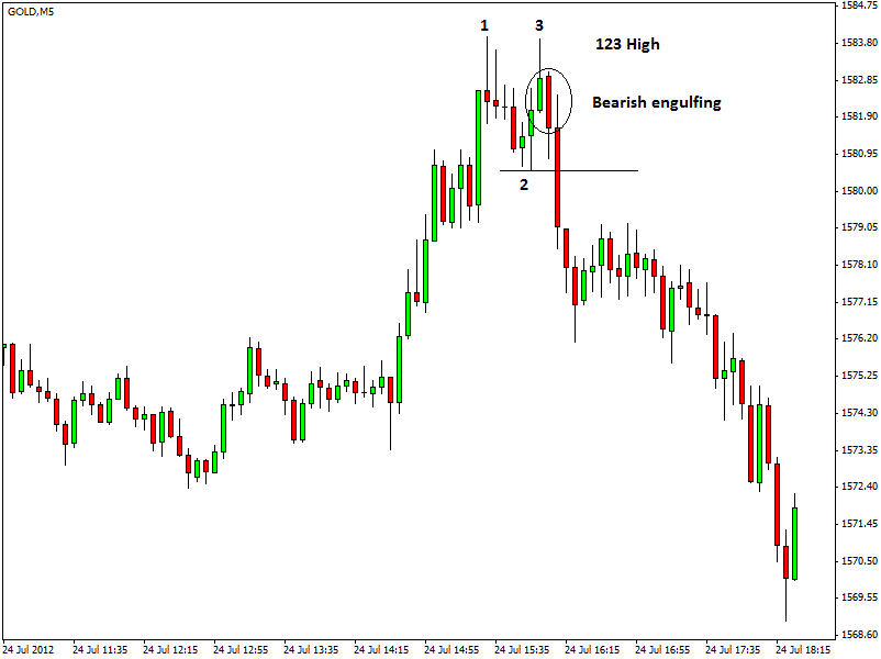 Il pattern 123 high di Joe Ross è uno dei più affidabili per ricercare le inversioni del trend intraday. Il pattern è molto più efficace quando viene accompagnato da altri pattern e/o filtri operativi. Nell’esempio in basso mostrato sull’oro, grafico a 5 minuti, si può notare la formazione di un bearish engulfing all’interno del pattern 123 high, che si completa con la rottura del supporto posto al numero 2.