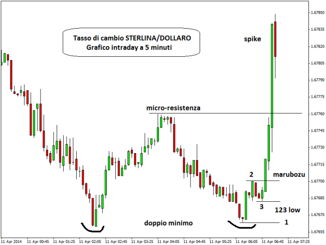 I prezzi formano un doppio minimo, dove il secondo bottom è anche leggermente più alto del primo bottom. Ciò vuol dire che la pressione dei compratori è stata così forte che i prezzi non sono riusciti nemmeno a testare i minimi precedenti. A un certo punto si forma una candela reversal ad ampio range e nei minuti successivi il pattern 123 low di Joe Ross. Il breakout del punto numero 2 del pattern avviene con una long marubozu e i prezzi metteranno il turbo nel giro di pochi minuti.