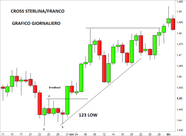 Il pattern 123 low (versione rialzista, quella ribassista è l’123 high) ha maggiori chance di successo se la volatilità evidenziata dalle candele che lo formano è bassa. Per capire meglio i concetti appena espressi andiamo a vedere l’esempio grafico riferito al tasso di cambio GBP/CHF, ovvero sterlina su franco svizzero. Dal daily chart si può vedere come l’inversione del trend dai bottom di periodo si concretizza dopo la formazione di un 123 low con bassa volatilità.