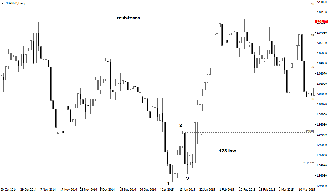 Se poi viene a configurarsi anche uno specifico pattern grafico, con uno swing del tipo 1-2-3, ecco che si spalancano le porte per una ghiotta opportunità di trading operativo. Oggi ci concentriamo sulla versione bullish, quindi sul segnale 123 low. Il chart giornaliero mostrato in basso si riferisce al tasso di cambio GBP/NZD, abbastanza liquido ma comunque volatile e caratterizzato spesso da spread piuttosto ampi rispetto alle coppie forex di tipo “majors”. Un momento importante si ha quando i prezzi formano il punto 3: è il segnale che il mercato ha trovato un buon supporto dal quale ripartire, tanto da non riuscire nemmeno ad avvicinarsi al punto 1.