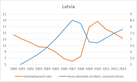 Le persone che lodano i Paesi Baltici tendono a replicare alle osservazioni di chi gli fa notare che la disoccupazione è ancora alta e il Pil nettamente al di sotto del livello pre-crisi, sostenendo che l’alta produzione e l’occupazione degli anni 2006-7 erano frutto della bolla speculativa e che non dobbiamo aspettarci che questi ritornino. Non credo che si rendano conto di quanto sia problematico questo argomento.