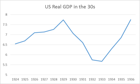 In relazione, pensiamo a cosa ciò implicherebbe per gli Stati Uniti negli anni ’30. Ecco il PIL reale per l’America negli anni 1924-1936: