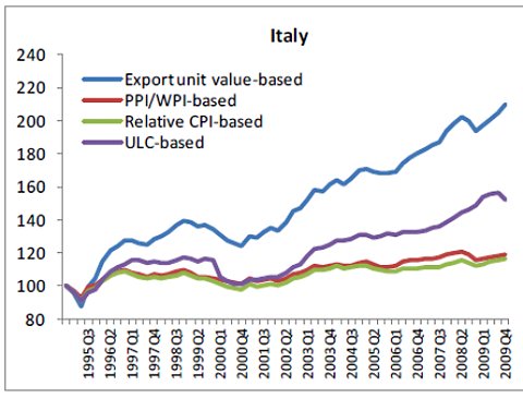 Una cosa che mi piace riguardo questa storia è che permette di dare un senso ad un’altra anomalia: l’ampia divergenza nelle diverse misure della competitività dei costi italiani. Ecco un grafico degli stimati tassi di cambio effettivi reali: