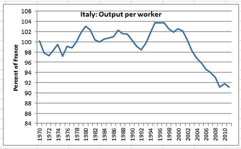 L’Italia viene spesso raggruppata con la Grecia, la Spagna, ecc nelle discussioni sulla crisi dell’euro. Eppure la sua storia è ben diversa. Non ci sono stati qui massicci afflussi di capiali, il debito è alto, ma i deficit non lo sono. La cosa che colpisce di più sull’Italia è una performance di produttività notevolmente triste dalla metà alla fine degli anni ’90. Ecco un confronto tra la produttività italiana e quella francese, misurata in termini di produzione per lavoratore, dal Total Economic Database: