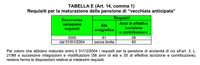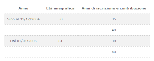 La pensione di vecchiaia anticipata (ex anzianità), che decorre dal primo giorno del mese successivo alla presentazione della domanda, è erogata coloro che abbiano maturato i requisiti dell’età anagrafica e di effettiva iscrizione e contribuzione così come indicati nella tabella.
