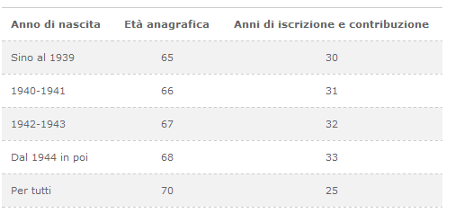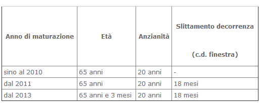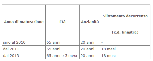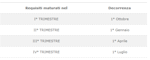 I requisiti per l’erogazione della pensione di vecchiaia, che decorre dal primo giorno del mese successivo a quello in cui si sono verificati i requisiti medesimi, sono riassunti nella seguente tabella.