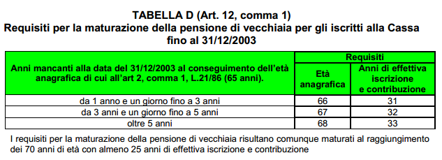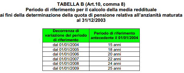 In particolare la pensione di coloro che possano far valere un periodo di effettiva iscrizione e contribuzione antecedente il 1° gennaio 2004 è formata sommando una quota calcolata secondo il metodo contributivo per il periodo dal 1 gennaio 2004 ad una quota che si continua a calcolare con il metodo reddituale, secondo le disposizioni della seguente tabella.
