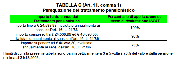 L’importo delle pensioni erogate dalla Cassa è perequato a partire dal 1° gennai o di ogni anno, in proporzione alle variazioni dell’indice nazionale annuo dei prezzi al consumo per le famiglie di impiegati ed operai calcolato dall’ISTAT, secondo i parametri della tabella e, secondo il Regolamento, non può comunque essere inferiore al limite superiore riferito alla pensione perequata corrispondente alla fascia immediatamente precedente della medesima tabella.