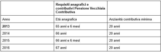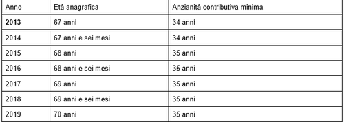 Anche in questo caso è previsto un’ innalzamento graduale dell’età da 65 a 67 anni, elevando ogni anno di sei mesi l’età richiesta.