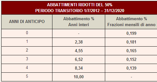 Le giornaliste che decideranno di andare in pensione a 60 anni potranno farlo con un abbattimento definitivo sul calcolo della pensione rispetto agli anni di anticipo mancanti al raggiungimento dei nuovi requisiti d’età. Questo sistema andrà a regime nel 2021, mentre la fase transitoria (1/7/2012 - 31/12/2020) prevede un abbattimento ridotto del 50%, secondo lo schema che segue.