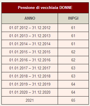 Dal 1° luglio 2012 i requisiti per accedere alla pensione di vecchiaia per le donne sono aumentati e sono quelli elencati nella tabella.