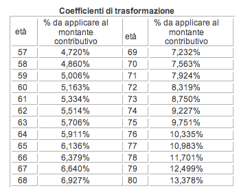 Secondo l’articolo 14 del Regolamento dell’Enpap, il calcolo della pensione avviene moltiplicando il montante individuale dei contributi per il coefficiente di trasformazione relativo all’età di pensionamento come illustra la seguente tabella: