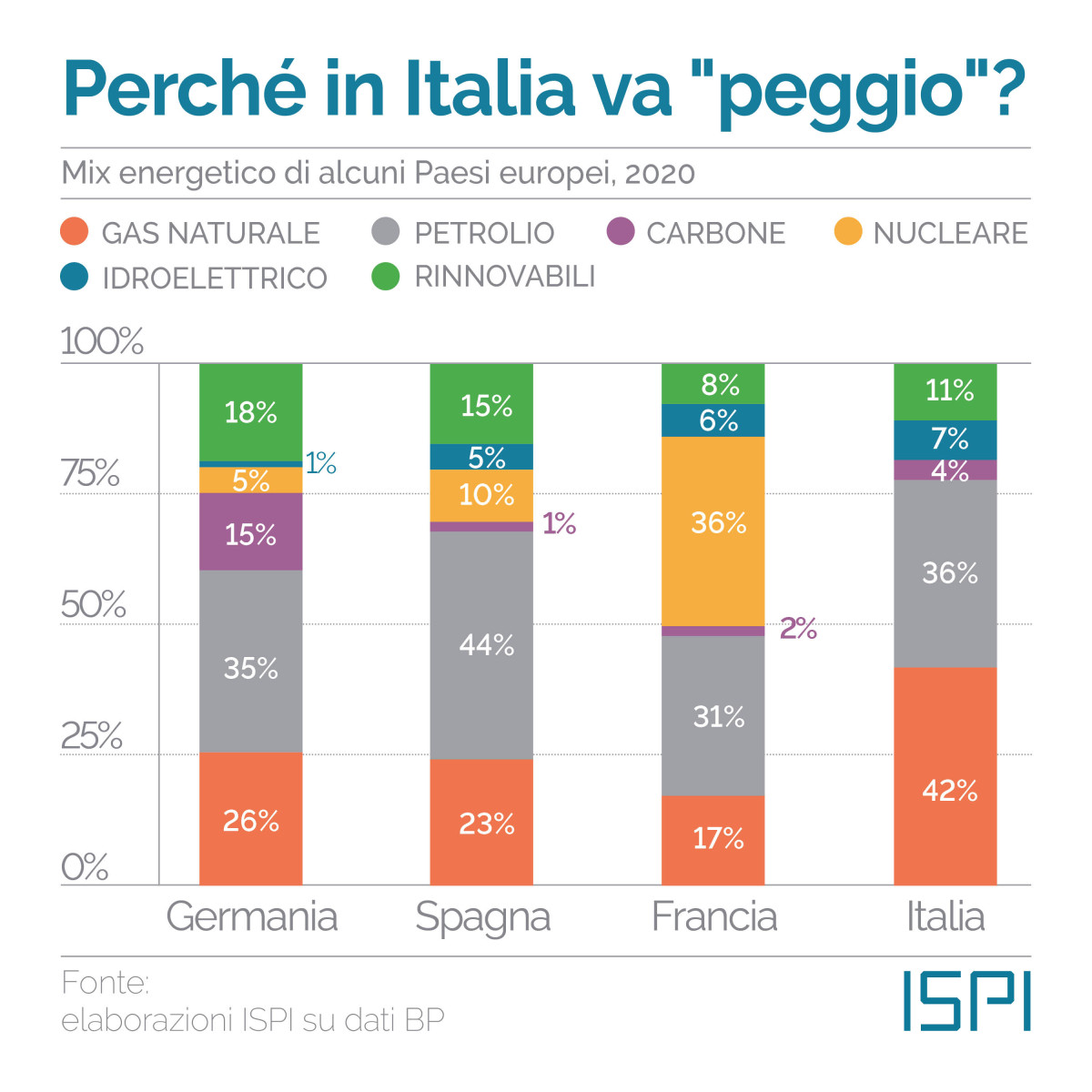 L’Italia non ha fonti nucleari e dipende più degli altri dal gas. La quota di rinnovabili, seppure è maggiore di quella francese, resta più bassa rispetto a Spagna e Germania. Il nostro Paese, in definitiva, è quello esposto alle fonti fossili petrolio e gas in modo maggiore degli altri.