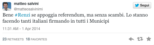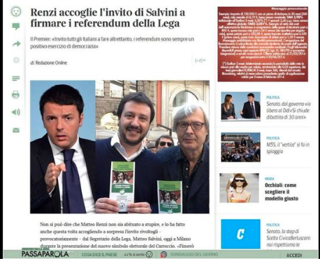 Da radio Padania invece arriva la notizia secondo cui il premier Renzi avrebbe deciso di sottoscrivere i referendum promossi dalla Lega. In particolare quelli che riguardano la legalizzazione della prostituzione, legge Fornero, burocrazia, abolizione della legge Mancino e stop ai concorsi pubblici per gli immigrati.