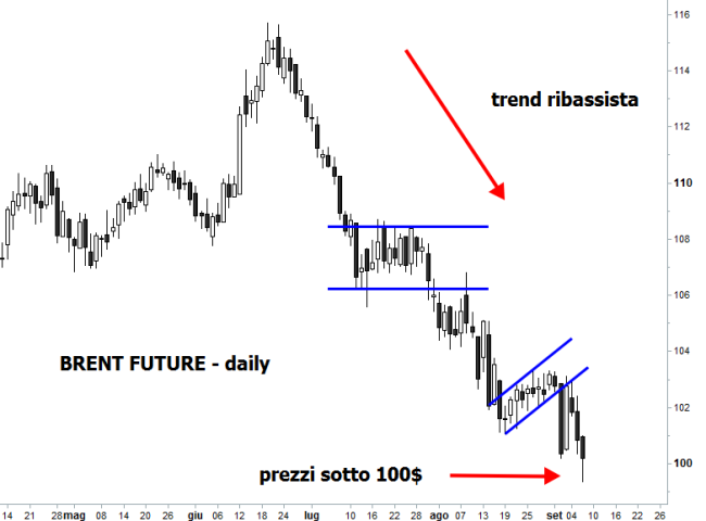 Le incertezze sull’economia mondiale, il rallentamento dei due grandi importatori di greggio al mondo (Cina e USA) e la forza del dollaro americano stanno spingendo al ribasso il petrolio, che sui mercati internazionali non riesce più a risollevarsi da oltre due mesi. Ieri a Londra il petrolio Brent, quello del Mar del Nord il cui prezzo fa da riferimento per i due terzi degli scambi globali, è crollato sotto i 100$ al barile per la prima volta da maggio 2013. Dai top di 115,69$ del 15 giugno scorso, il Brent è arrivato a perdere più del 16% visto che ieri ha registrato un bottom a 16 mesi a 99,37$ al barile. I prezzi hanno comunque raggiunto un’area di supporto chiave di medio-lungo periodo, dalla quale potrebbe avvenire un deciso rimbalzo tecnico.