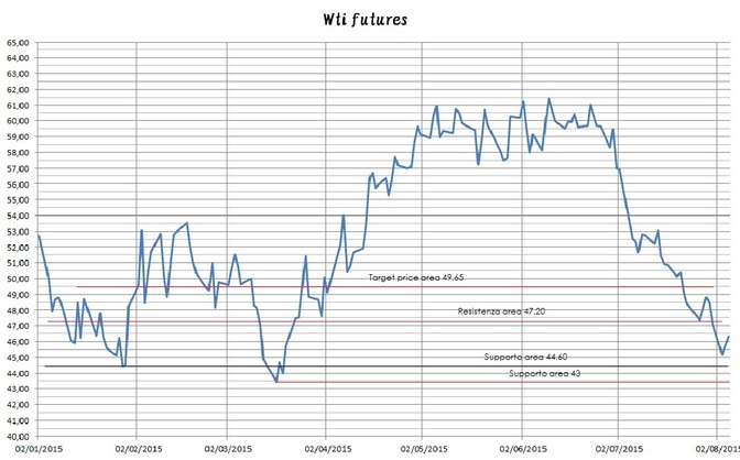 In questi giorni il prezzo del greggio si è avvicinato a quest’area, segnando un 45.20 di minimo l’altro ieri, e poi sembrerebbe tentare di accennare ad un piccolo rimbalzo tecnico.