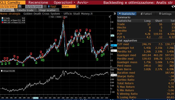 Golden-Death cross trading system su WTI future. Fonte: Bloomberg