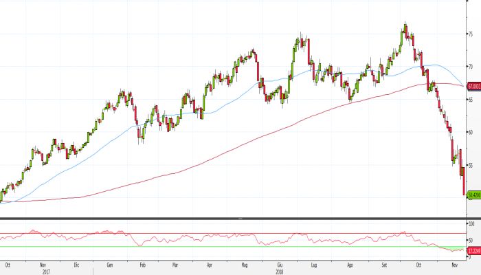 Sembra non fermarsi la discesa delle quotazioni del WTI. Alle quotazioni di chiusura della scorsa settimana il Future segnava un passivo di oltre il 33% dagli ultimi top relativi registrati il 3 ottobre. Il prezzo del petrolio quotato al NYMEX sta vistosamente accelerando al ribasso attestandosi al momento sui minimi da oltre 12 mesi, dai 76,90 dollari al barile toccati il mese scorso.